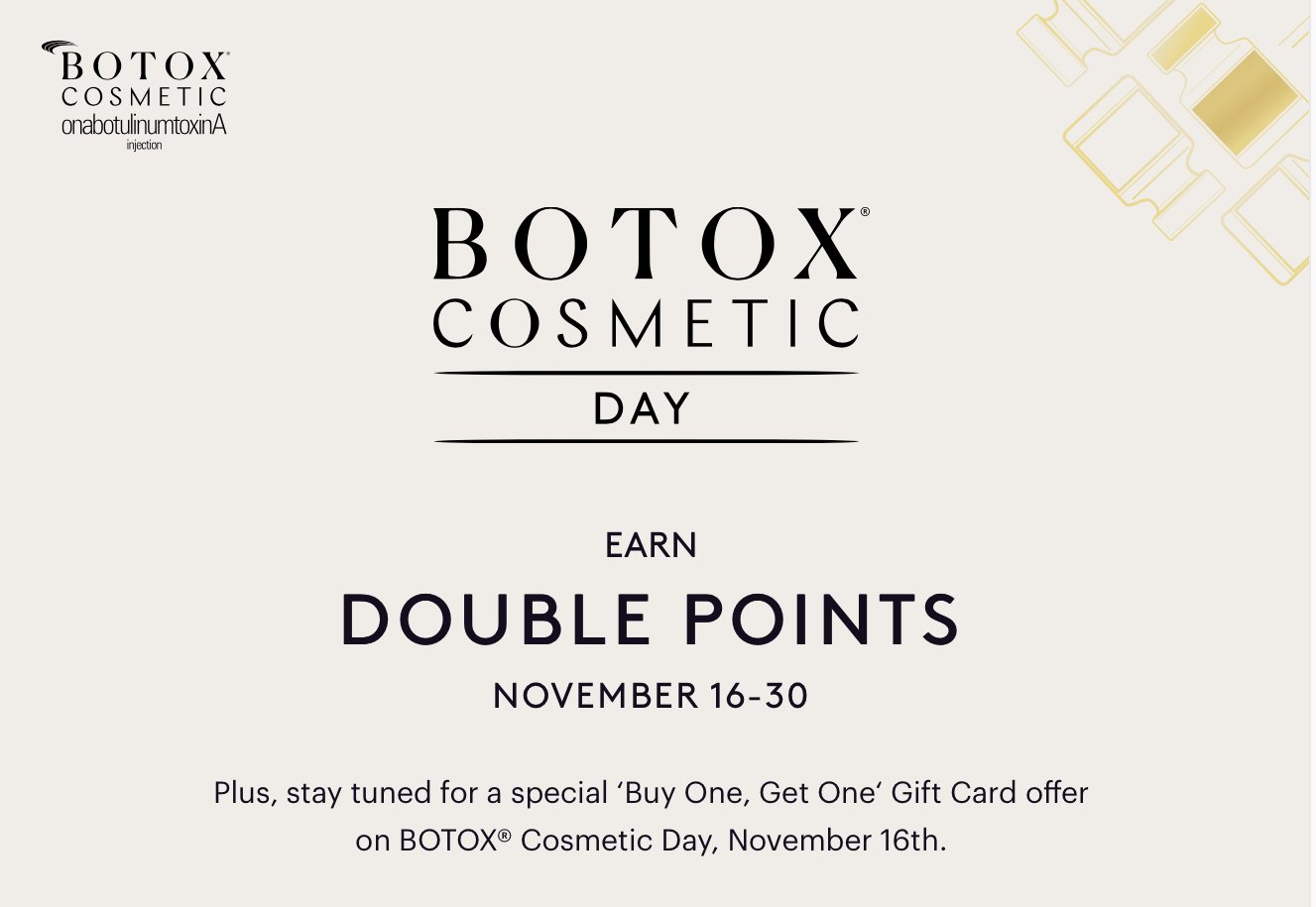 BOTOX Cosmetic onabotulinumtoxinA 02. BOTOX COSMETIC DAY BOGO GIFT. Earn Double Allé Points November 16-30 2022.